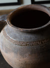 Beautifully hand-thrown terracotta pot, with remnants of a glazed band and faded hand-painted decoration which has some blackened patina from years of sitting over an open fire, gently cooking or heating food.