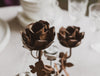 Each of the three candle holders is a metal rose and are surrounded by porcelain roses, delicately sculpted and glazed in soft white, contrasting beautifully with the aged metal framework.